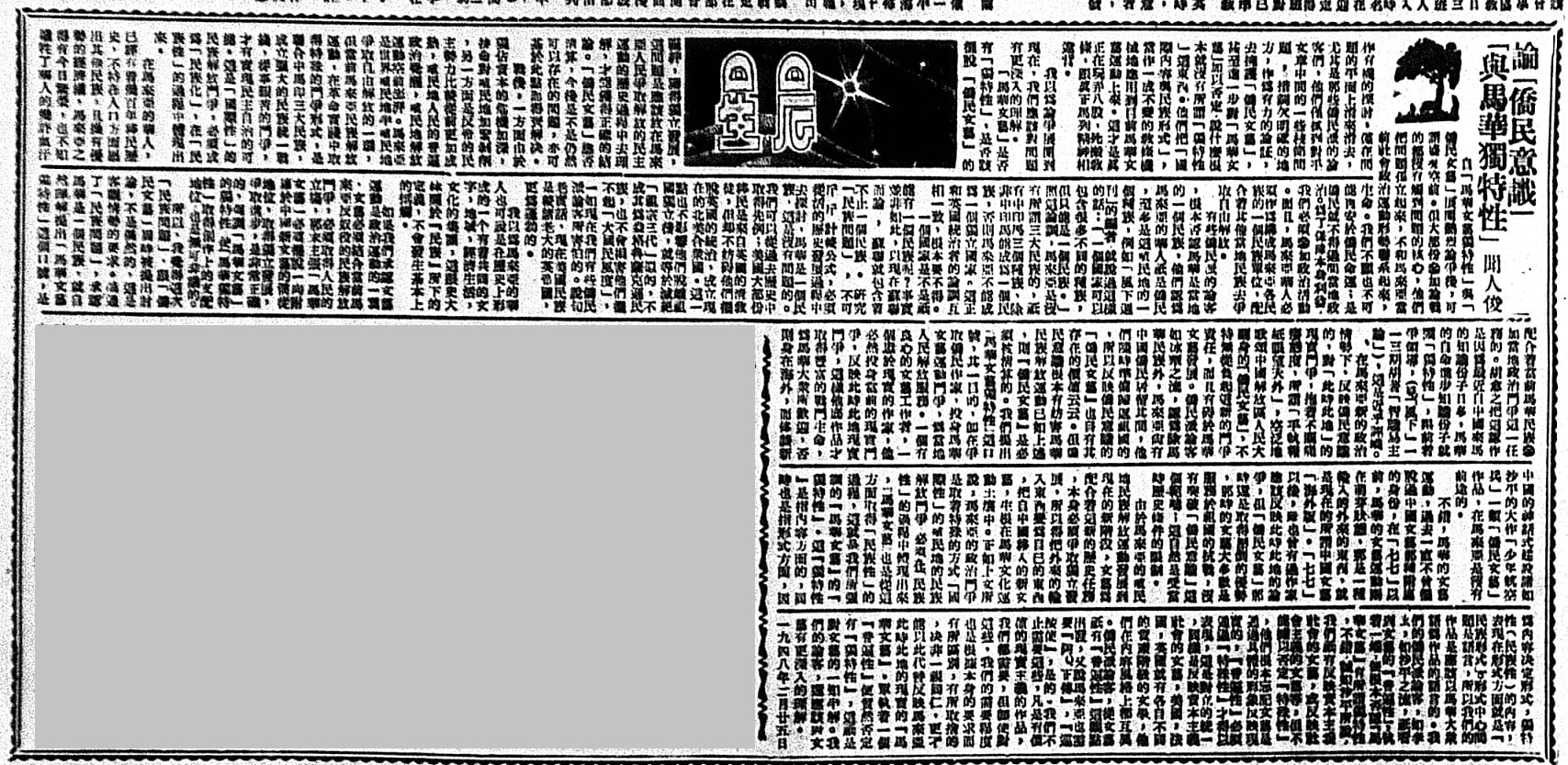 In this article by Miao Xiu, he explores Anglophone and Sinophone literary writing in 1950s Malaya, with a focus on how the phenomenon of language mixing arose in response to the socio-political exigencies of the period. It reveals the inextricable relationship between language, literature and society. Reproduced from《論僑民意識與馬華獨特性》,《星洲日報》[Xing Zhou Re Bao\],28 February 1948. Microfilm no. A01597333I. (From National Library, Singapore).