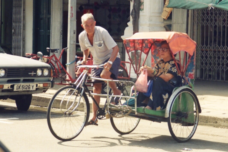 A trishaw with passenger at Syed Alwi Road, 1993. This was how locals commonly got around Singapore in the 1950s and 60s. Liesel Strauss Collection, National Library, Singapore.