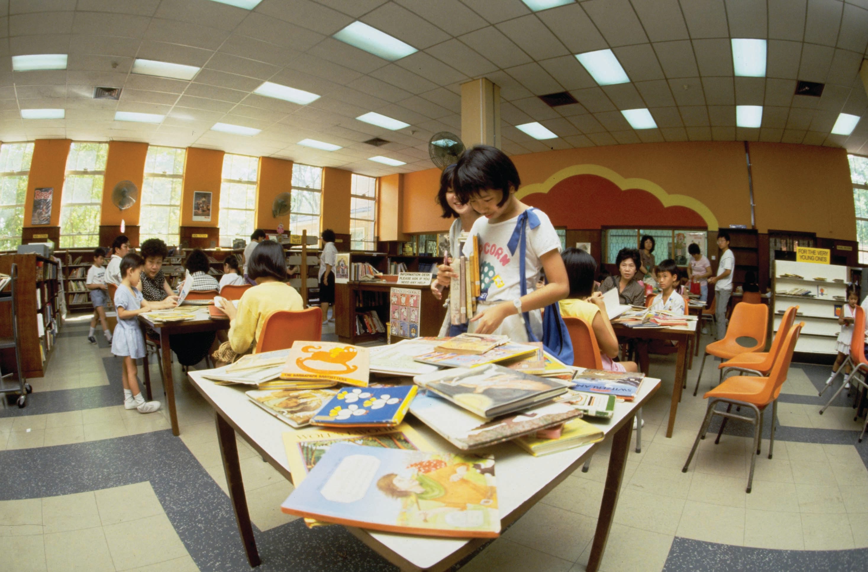 孩子们在前新加坡国家图书馆翻阅儿童图书,摄于上世纪八十年代。MITA collection, courtesy of National Archives of Singapore.