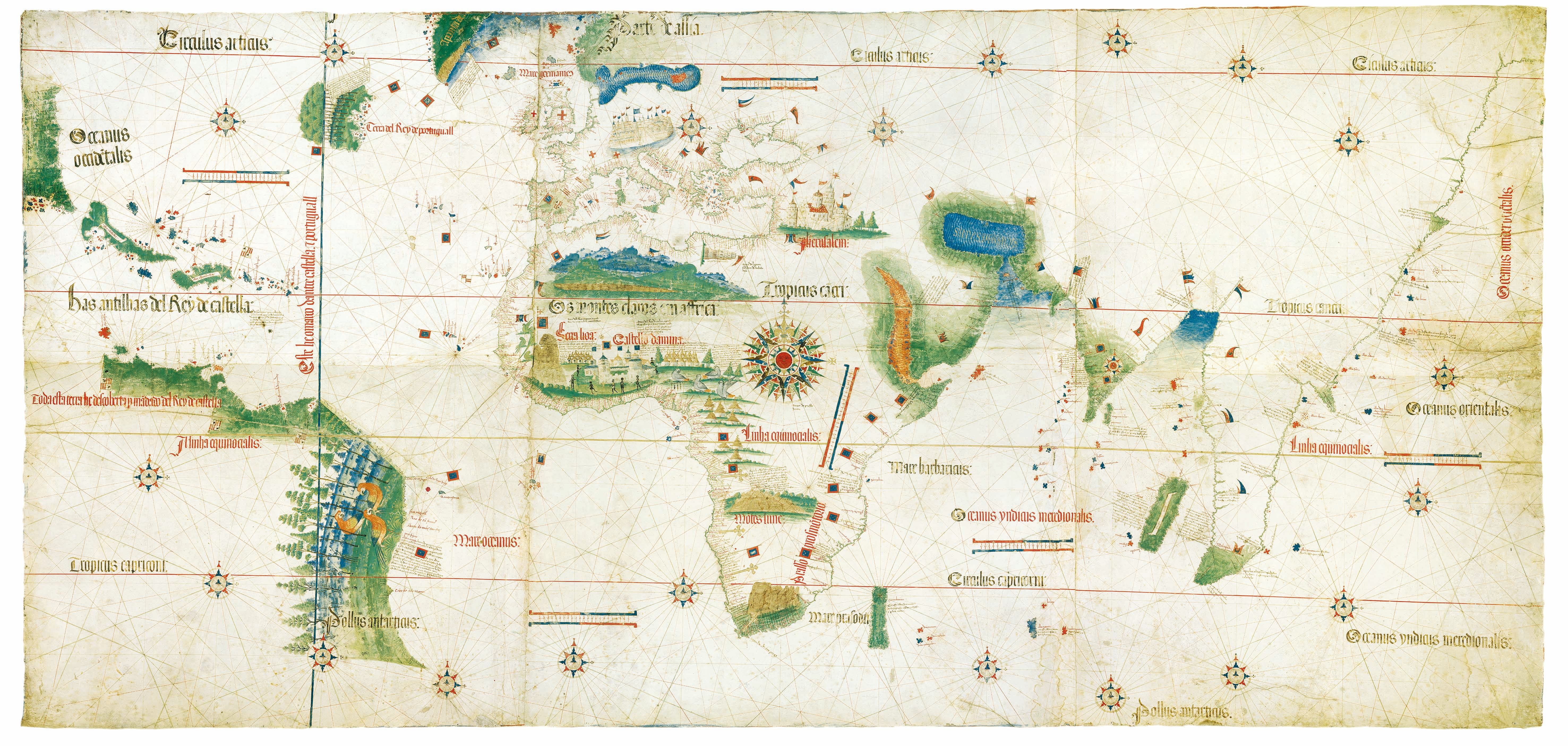 Cantino Chart, Anonymous 1502. Based on the latest information from Portuguese explorations, secretly obtained by Albert Cantino, the map depicts the Malay Peninsula as an elongated promontory that reaches the south of the equator. Biblioteca Estense Universitaria, Modena, C.G.A. Permission from the Ministry of Arts, Culture and Tourism, Italy.
