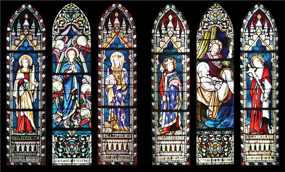 Triptych windows found in the side chapels at the Convent of the Holy Infant Jesus. From left to right: St Cecilia, St Mary and St Clothilde (left chapel); and St Louis, The Death of Saint Joseph, and St Charles Borromeo (right chapel). Courtesy of Swati Chandgadkar.