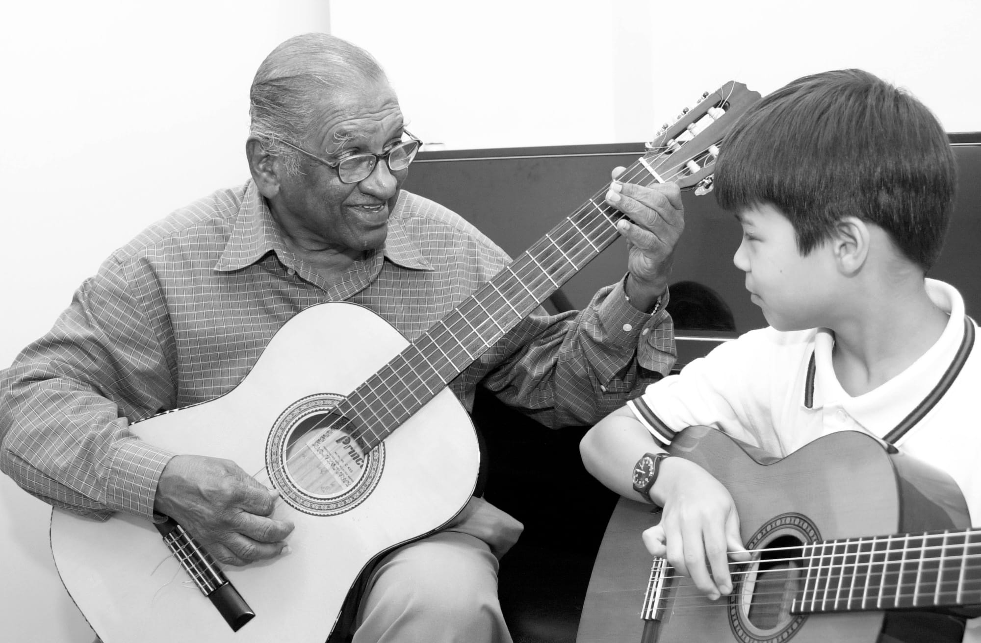Alex Abisheganaden teaching a young boy how to play the guitar (undated). All rights reserved, Eric Foo Chee Meng 1979–2001, Courtesy of National Arts Council.