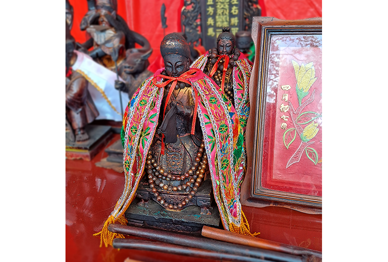 A solution came from Baosheng Dadi, the patron deity of Zhen Ren Gong (Chin Lin Keng; 真人宫), one of Zhen Long Gong’s constituent temples. During a ceremony, his statue was placed on a palanquin, and his spirit possessed his palanquin bearers, enabling them to trace a divine message in a heap of ashes. In writing, he granted Lin Guniang permission to be worshipped within his temple. The very same palanquin was later used to transport her statue to Zhen Long Gong.