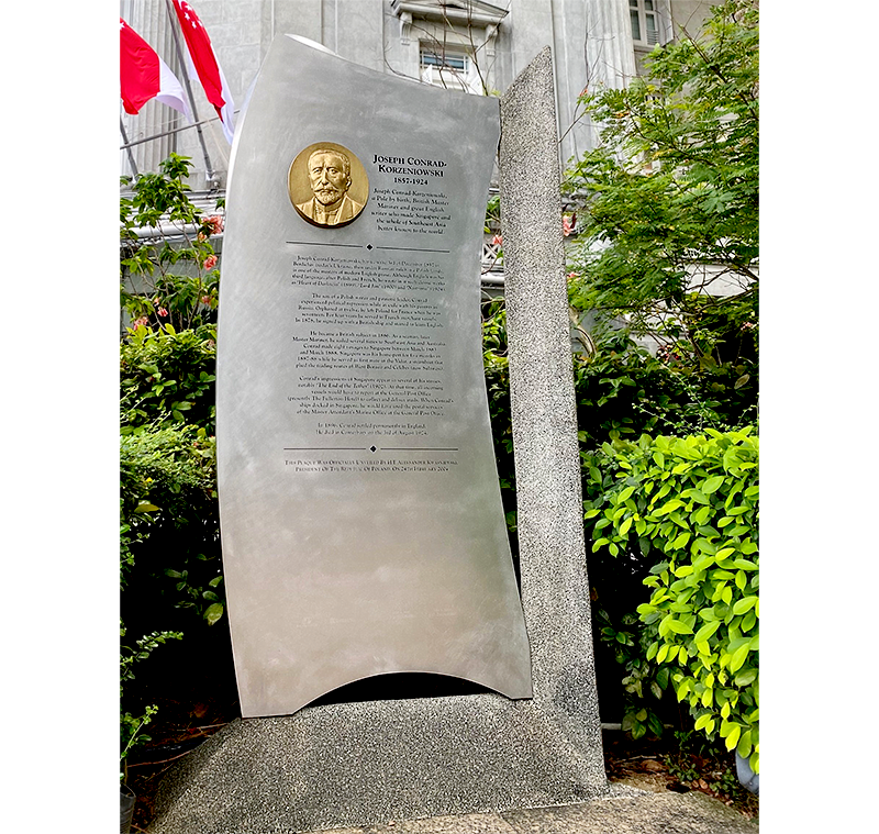 A metal plaque dedicated to Joseph Conrad stands in front of the Fullerton Hotel in Singapore. The text on the memorial describes Conrad as a “British Master Mariner and great English writer who made Singapore and the whole of Southeast Asia better known to the world”.