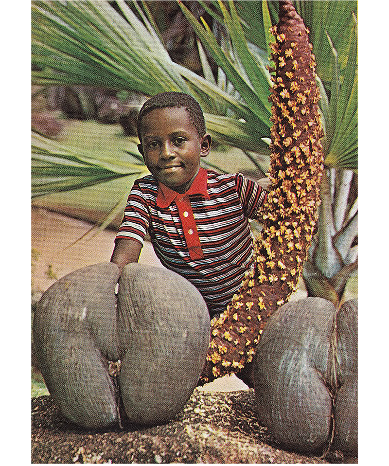A Seychellois boy at Vallée de Mai, Praslin, Seychelles, early 1970s. The fruit of the double coconut has two lobes and loosely resembles a woman’s pelvis. The male flowers are borne on sausage-like stalks that can grow up to 2 m long. Photo by Dino Sassi - Marcel Fayon, Photo Eden Ltd. From Wikimedia Commons.