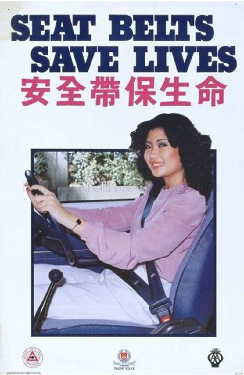A poster designed in conjunction with the 1981 National Seat Belt Campaign portraying a female driver wearing the three-point lap- shoulder seat belt. Singapore Registry of Vehicles Collection, courtesy of National Archives of Singapore (Media - Image no. 19990005279 - 0003). [The Singapore Registry of Vehicles became a part of the Land Transport Authority in 1995.]