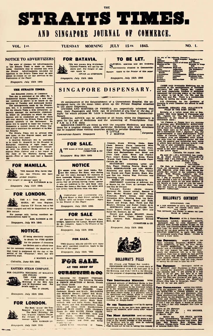 2 “Page 1 Advertisements Column 1,” Straits Times and Singapore Journal of Commerce, 15 July 1845, 1; “The Morning of Tues., July 15, 1845,” Straits Times and Singapore Journal of Commerce, 18 January 1953, 3; “150th Anniversary,” New Paper, 8 July 1994, 24. (From NewspaperSG); C.M. Turnbull, Dateline Singapore: 150 Years of the Straits Times (Singapore: Singapore Press Holdings, 1995), 13–17. (From National Library Singapore, call no. RSING 079.5957 TUR)