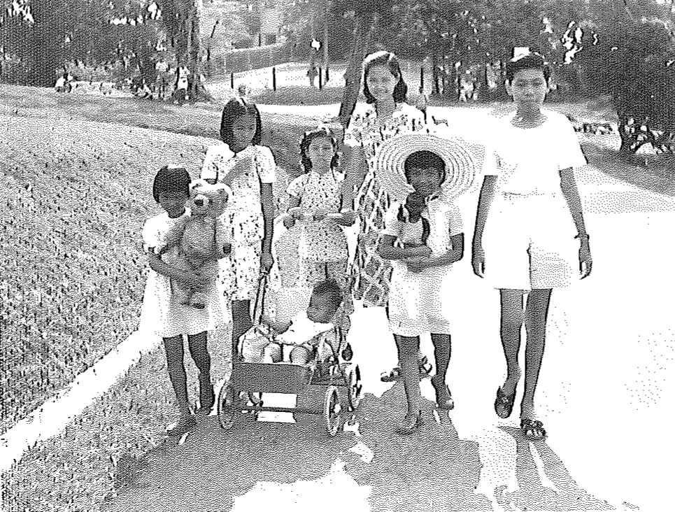 The author in the pram being pushed by Ah Sun (third from left), 1954.