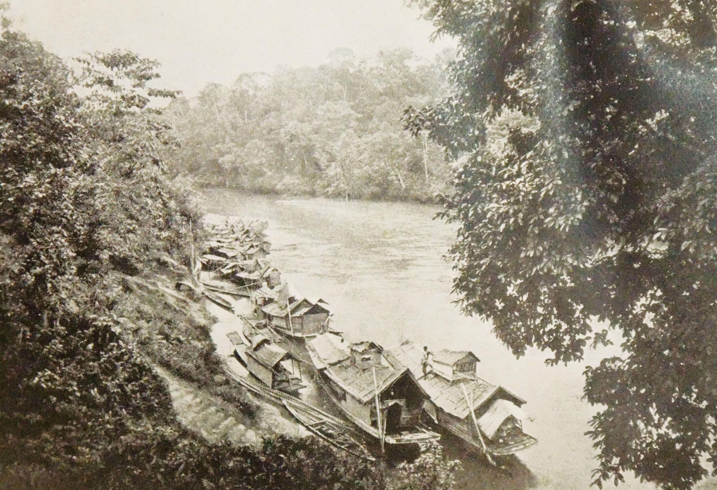 Malay houseboats on Pahang River at Kuala Lipis. An Illustrated Guide to the Federated Malay States, 1910, p. 84.
