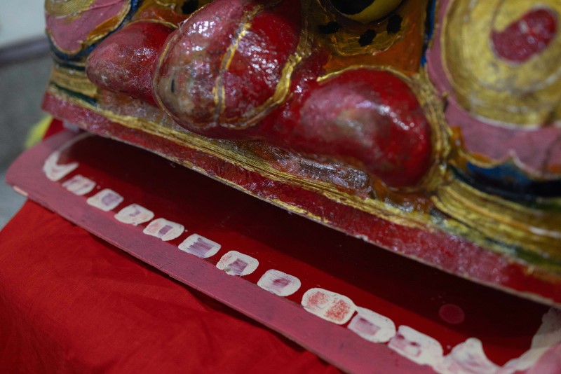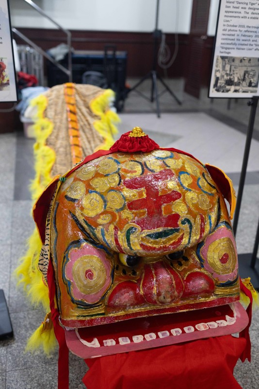 When Foo saw the full Hainan tiger at Luowu Village, he was astonished that it bore many similarities to the Hainan lion head in Gwang Wu’s possession in Singapore. The Hainan tiger had been brought to Singapore in the 1960s but it did not appeal to the masses, and thus rarely performed. At the time, the people were much more familiar with the Southern or Foshan (佛山), lion dance from Guangdong, especially during the Lunar New Year, and preferred a lion over a tiger to perform the “plucking of greens” (採青; cai qing) ritual to usher in good fortune and tidings.