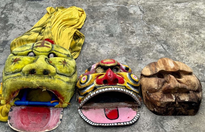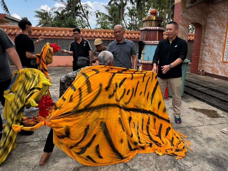 Tiger heads from Sanjiang Town, 2024. Courtesy of Raymond Foo.The tiger dance was introduced to Hainan from the Central Plains during the Ming Dynasty and is still popular in the rural areas around Sanjiang Town. The Hainan tiger dance features routines such as fighting tigers and solo tiger performances. Each dance troupe comprises about 20 to 30 performers, and each tiger requires two dancers – one as its head and the other as the tail. While the tiger dance features movements similar to the Hainan lion dance, its dancers adopt a much lower stance than that of the Hainan lion, allowing them to draw strength from deep, rooted stances that mirror the animal’s low, prowling gait. The tiger’s force — 虎劲 (hu jin) — rises from the ground, gathering in the dancers’ hips and spines before releasing in sudden, explosiveness (爆发力, baofali) that give the dance its unmistakable power. In embodying the tiger, every crouch, creep and pounce depends on staying close to the ground, allowing the dancers to channel the creature’s stealth, tension, and raw momentum. Other troupe members take on roles such as soldiers and deities – namely the Chinese earth god 土地公 (Tu Di Gong) and his wife 土地婆 (Tu Di Po).3