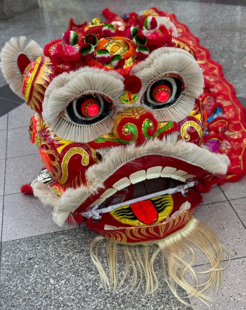 Undeterred (and thanks to a sponsorship in 2022), Foo ordered a Hainan lion from Lai Holin (黎贺年), a Malaysian master from Long Xin Dragon and Lion Dance troupe (马来西亚龍芯武术龙狮团) in Kuala Lumpur. Unlike the earlier lions, this Hainan lion’s eyes faced forward, and appeared bright and energetic. Its hair was made of stiffer horsetail hair giving it a more imposing look. Like its predecessors, the lion did not have a horn on its head. Although it was much lighter at 5 kg, with the head weighing about 3 kg, it was still challenging for the Guang Wu lion dancers to carry out deft manoeuvres such as balancing on high poles. However, they “still aim[ed] to incorporate [the] traditional aspects [of Hainan lion dance] to pass down the culture and heritage of this folk art form [to the next generation]”.10