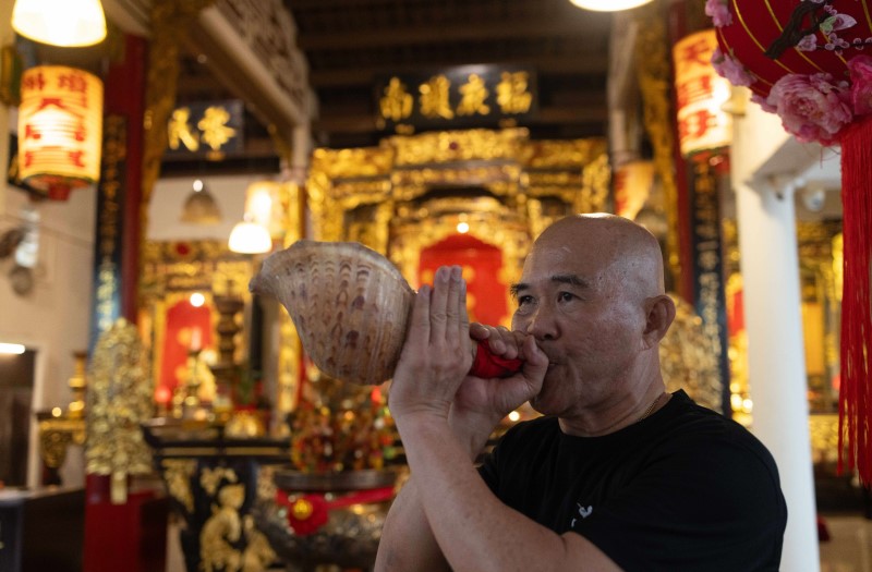 Raymond Foo made the traditional tempo of the percussions more upbeat. Courtesy of Low Jue Ming.Both the Hainan lion and tiger dances begin with the shifu or trained senior troupe member blowing into a conch shell.12 This heralds the start of the performance, representing 冲天 (chongtian), or soaring to the heavens, a metaphor for great ambitions or achievements. The sound of the conch is also believed to purify the space and dispel negativity, creating a positive and auspicious environment for the performance.