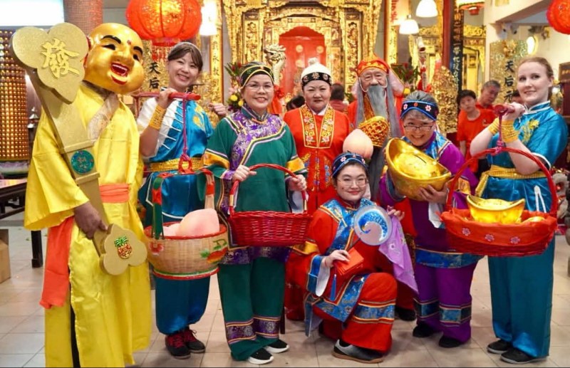 Raymond Foo performing with the 双鱼撞 (shuangyudang or double fish shield). Courtesy of Low Jue Ming.Troupe members representing the deities Tu Di Gong and Tu Di Po closely mimic the movements of the lion, with graceful, rhythmic steps. Then, with a sudden burst of energy, shouts fill the air as soldiers (兵勇, bingyong) appear, ready to take on the lions. The Guang Wu dancers bring the beasts’ nimble, swift movements to life, while the soldiers’ bravery and expert martial arts skills add to the thrill for a truly breathtaking display.