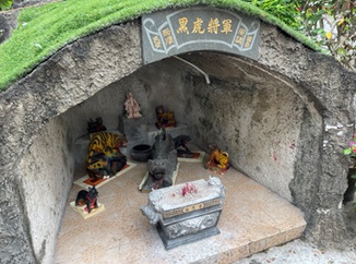 Tudi Gong (top) with multiple Huye (tiger deity) and Tian Gou (bottom left) and Hei Hu Jiang Jun (the tiger general, middle) at Poh Tiong Beo Temple in 2022. Courtesy of Angela SimThe effigies of Tu Di Gong and Tu Di Po and Huye (the tiger deity), or the tiger general (虎将军, Hu Jiang Jun, who falls under the tutelage of Tu Di Gong), are often seen together beneath the main altar of most Taoist temples, watching over and protecting the local community. The tiger dance dramatises the struggle between humans and tigers, showing how people use intelligence, skill and martial prowess to overcome these formidable creatures. Once the tiger is subdued, the dance celebrates the possibility of harmony, symbolising a balance between human courage and respect for nature.4