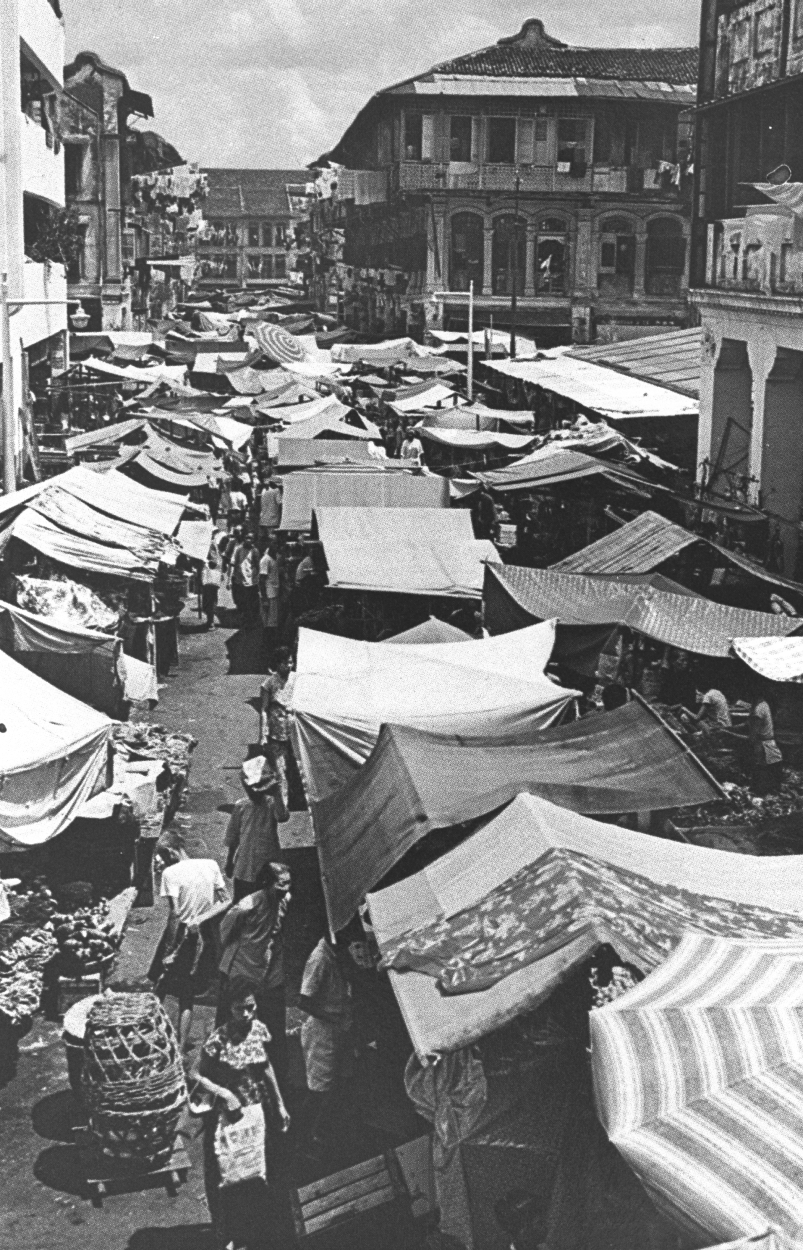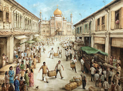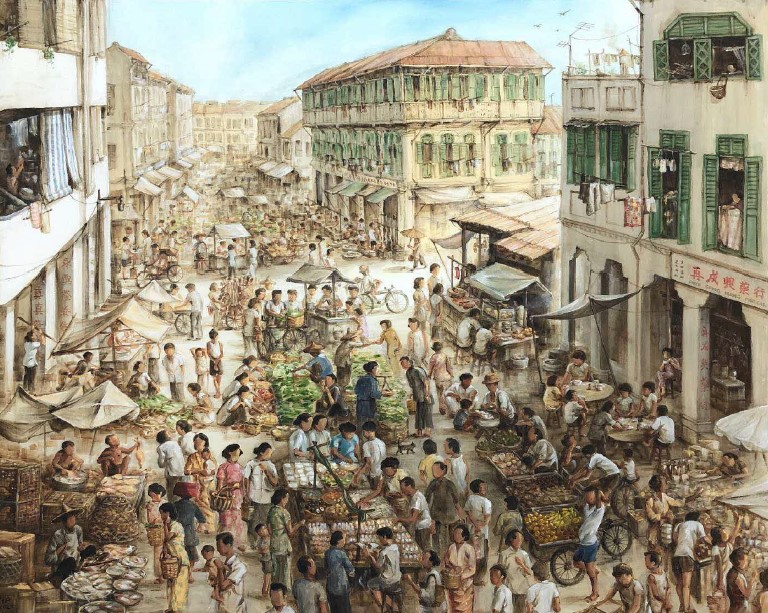 A wet market on Trengganu Street, Chinatown, c. 1960. In the background is the former Lai Chun Yuen Opera House. Courtesy of National Archives Singapore (Media - Image no. 19980005922 - 0089).In works like “Trengganu Street Market”, Yip was drew from his own memories growing up in Chinatown. However, in other works, archival research and old photographs play a bigger role. In “Preparing for the Haj” (2020), the canvas captures a cross-section of Bussorah Street bustling with activities surrounding the Haj preparations, with the grand Masjid Sultan (Sultan Mosque) in the background.6