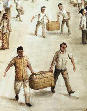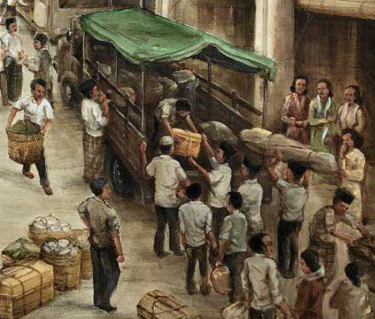 “Preparing for the Haj” (2020) captures the Haj preparations on Bussorah Street, with Sultan Mosque in the backgrounds. Courtesy of Yip Yew Chong.The work shows, among other things, two men walking down Bussorah Street, jointly carrying a trunk, while several others load luggage onto trucks as women gather nearby, waiting to bid farewell to departing pilgrims. These two elements in the painting were inspired by photograps that can be found in the National Archives of Singapore.