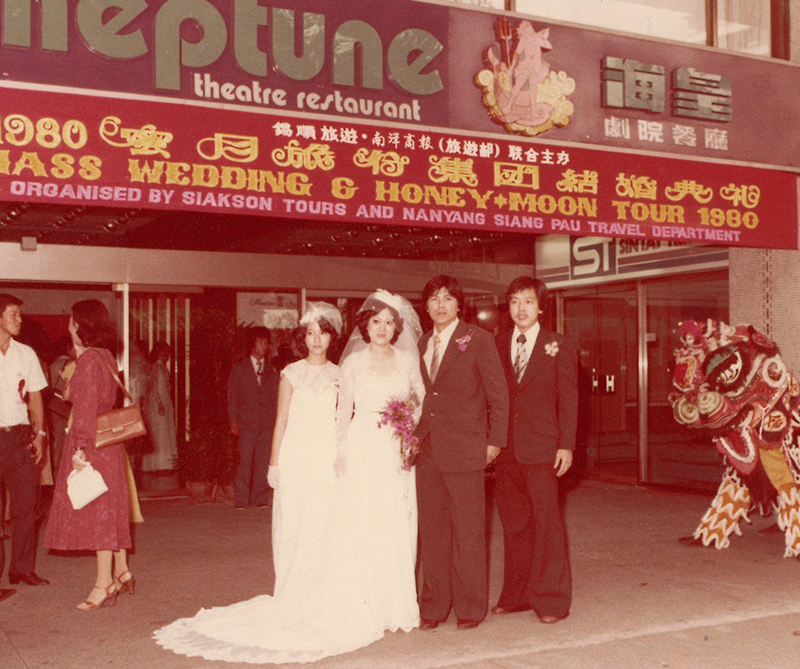 Even as late as the 1980s, couples were still choosing to get married at mass wedding ceremonies. On 18 May 1980, Tan Li Kheng, now 71, and her husband Lee Chun Ho were married at the Neptune Theatre Restaurant in Mandarin Hotel at one such wedding. The event was organised by Siakson Tours and the Nanyang Siang Pau Travel Department and involved more than 80 couples. “Mass weddings were fashionable in those days,” she recalled. “I paid $2,800 that included the wedding ceremony, one table for guests for the lunch reception, and the 19-day honeymoon trip to Bangkok, Tokyo, Seoul, Taipei and Hong Kong. At each location, we had photo sessions and a dinner, and also received lots of souvenirs.” Tan found the entire experience memorable.30 The event was reported by Nanyang Siang Pau.31