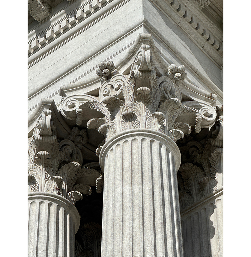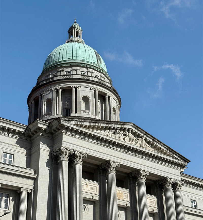 Nolli’s contributions to the old Supreme Court building (restored with the former City Hall building and now part of the National Gallery Singapore) are perhaps the easiest to observe. In addition to the Corinthian columns which make the facade so grand, Nolli worked on the relief (a wall-mounted sculpture raised from a flat base) in the tympanum, which is the triangular decorative section just above the columns. The sculpture shows Lady Justice holding weighing scales and a sword – symbolising law and judgment – alongside figures reacting to her judgment (see photograph on page 39).1