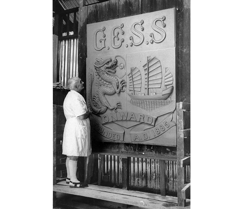 In 1951, Nolli designed and made the coat of arms for three High Court halls which had been “without a coat of arms since the re-occupation”.18 Nolli’s later works demonstrate the importance of architectural commissions in the postwar restoration of large-scale institutional buildings. He also worked on decorative details for schools that were built during this period, crafting the crest for the new Gan Eng Seng School and working on a set of reliefs of angels for the school chapel of St Anthony’s Convent in 1952.19 Nolli also worked on the Omar Ali Saifuddien Mosque in Brunei for some time, though the Straits Times 1964 report that he retired in 1956 suggests that he did not stay on to see the mosque being completed.20