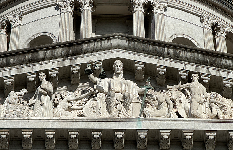Nolli’s version of Lady Justice may be explained by the neoclassical aesthetic which informed much of Nolli’s work in the 1920s and 1930s. Nolli seemed to have combined aspects of Lady Justice with those of the Roman goddess Minerva. Closely associated with wisdom and justice in Roman mythology, Minerva is consistently depicted with a shield and sword.33 These attributes are clearly visible in Nolli’s tympanum. On the other hand, Minerva rarely, if ever, appears with the weighing scales that are also clearly visible in Nolli’s Lady Justice, suggesting that his creation is a combination of both Lady Justice and Minerva.