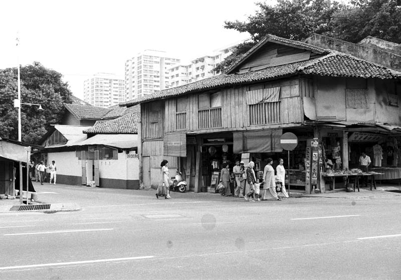 Row of shophouses along Onan Road in 1983. This multiracial neighbourhood in the East Coast was where the author spent his formative years. From the Lee Kip Lin Collection. All rights reserved. Lee Kip Lin and National Library Board, Singapore 2009.