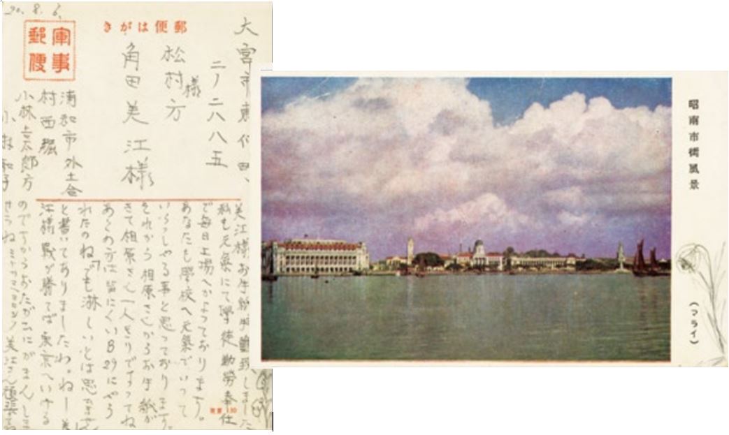 A Japanese postcard featuring the waterfront and skyline of Syonan City (Singapore) dated 6 August 1945. Visible from the photo is the General Post Office (today’s Fullerton Hotel), the Victoria Theatre and Concert Hall, the old Supreme Court and Municipal Building (today’s National Art Gallery) and St Andrew’s Cathedral. The writer, Wako Kobayashi, describes her life as an apprentice in a factory and her future plans when the war ends. She encourages Mie Kakuda, the addressee of this postcard, to press on during this time of adversity. (Accession no.: B32413808G)