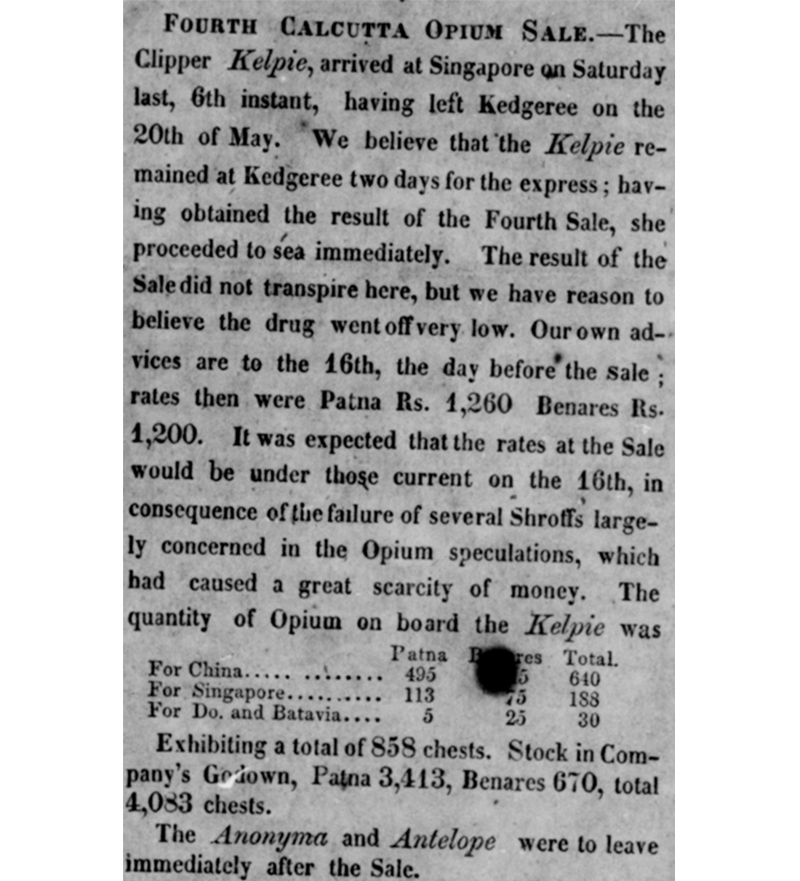 “Fourth Calcutta Opium Sale,” Straits Times, 10 June 1846, 2; “Page 4 Advertisements Column 1,” Straits Times, 13 June 1846, 4. (From NewspaperSG) ↩