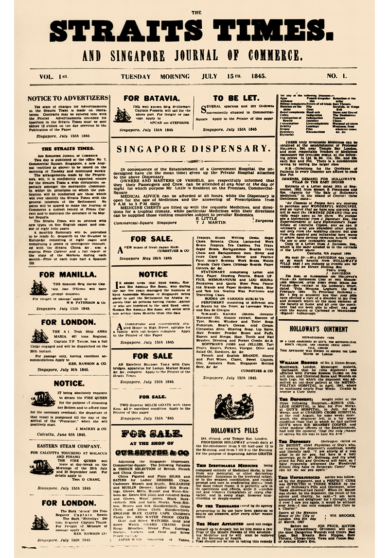 The first issue of the Straits Times and Singapore Journal of Commerce (as it was originally named) rolled off the presses in July 1845. Back then, it competed with the only other English-language newspaper, the Singapore Free Press.